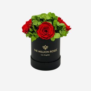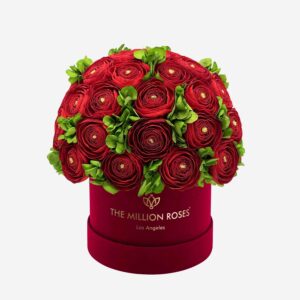 A fusion of flowers that showcases sustainable luxury and jubilance. The Million Roses Classic Box brings together medley of red Persian buttercups and charming green hydrangeas to effortlessly capture opulence. Resting in a smooth. hand-crafted bordeaux suede box. this bouquet is suited to be a special occasion gift or an everyday treasure in an entryway…