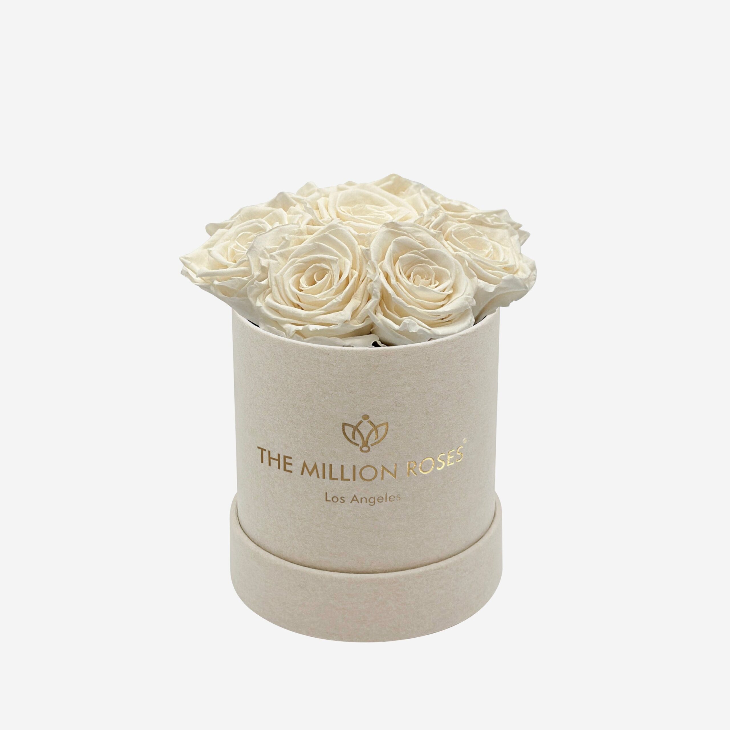 The hand-crafted beige suede box in our signature Basic arrangement showcases white preserved roses.