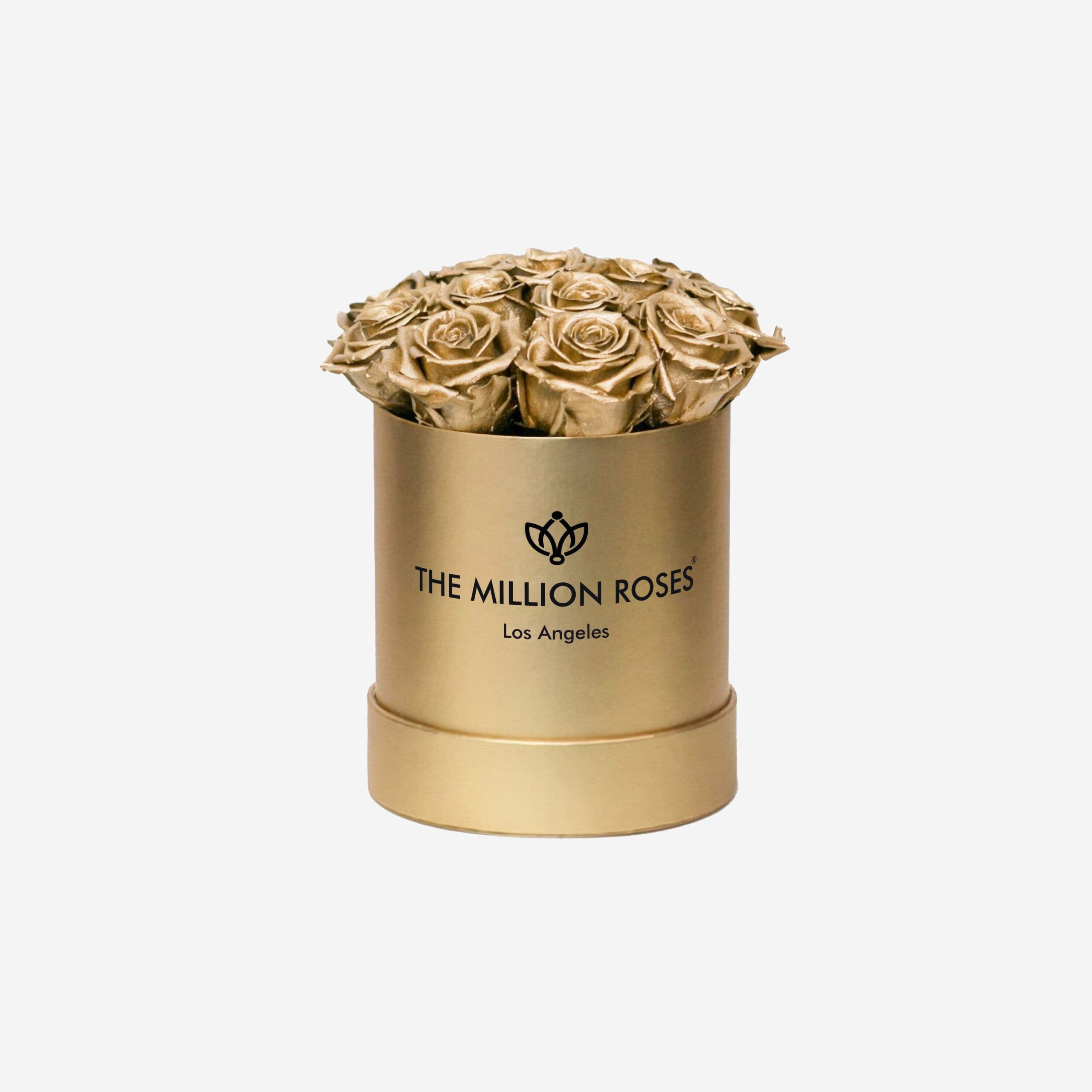The hand-crafted gold box in our signature Basic arrangement showcases gold preserved roses.
